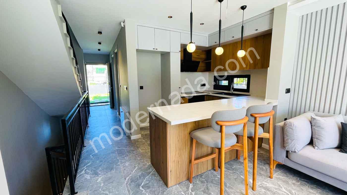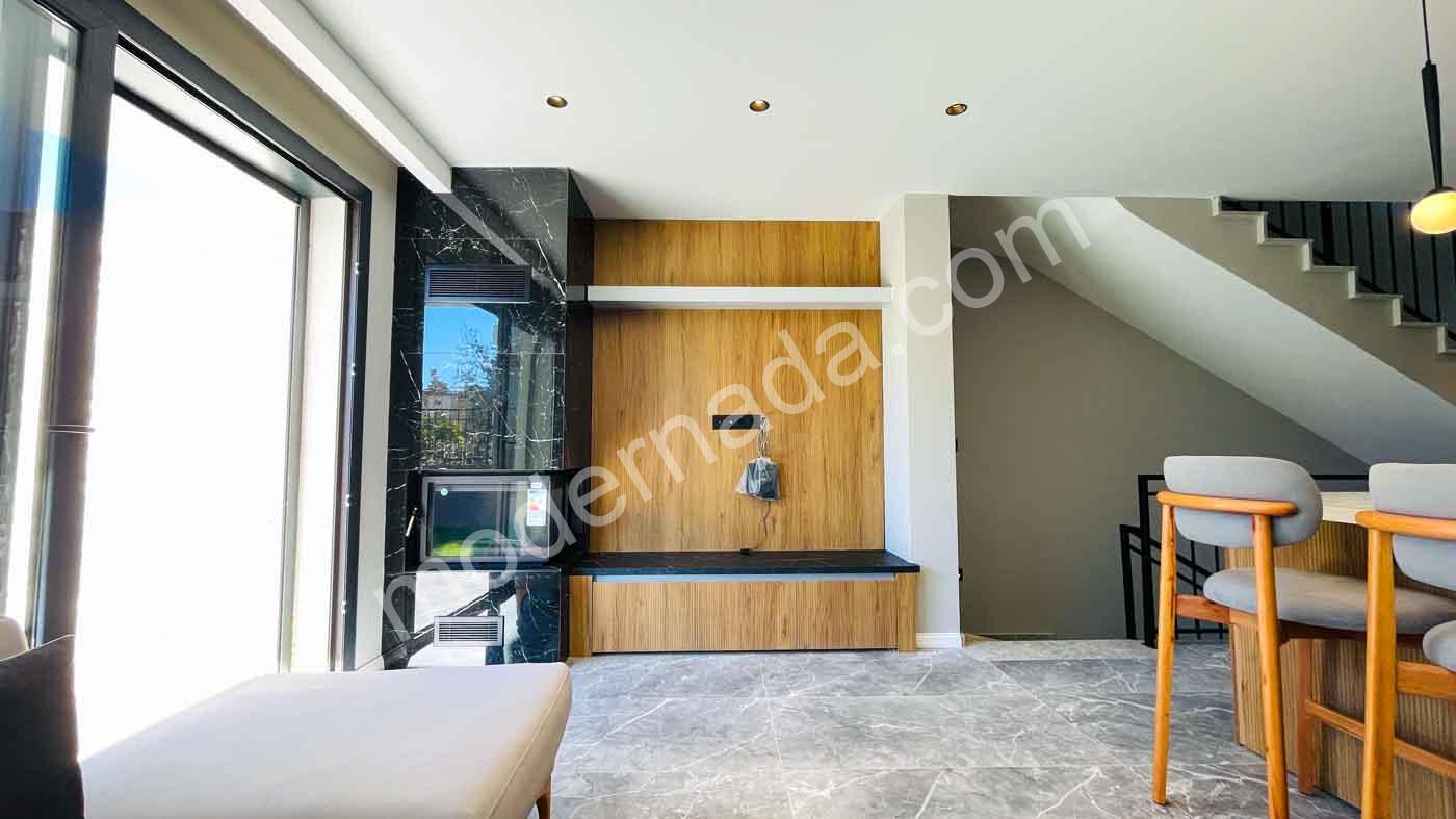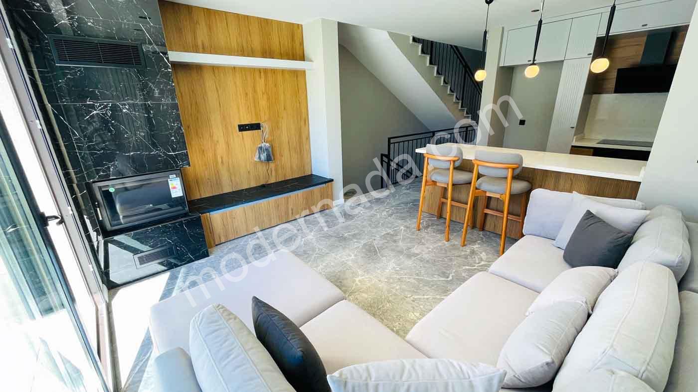 Geniş ve ferah salon, modern açık mutfak, 1 oda, WC & banyo, ön teras ve salonda şömine.